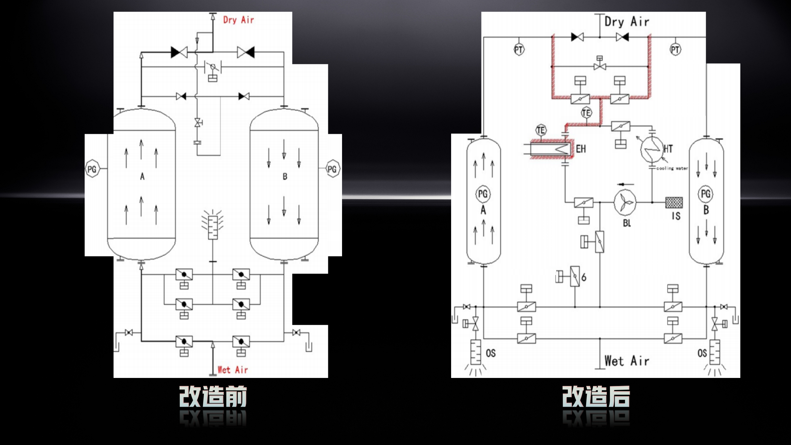 據(jù)了解,原設(shè)備為同行廠家 150 立方無熱再生吸附式干燥機,我司經(jīng)深入現(xiàn)場工況分析,創(chuàng)新提出‘零氣耗鼓風(fēng)熱再生吸附式干燥機改造方案’。