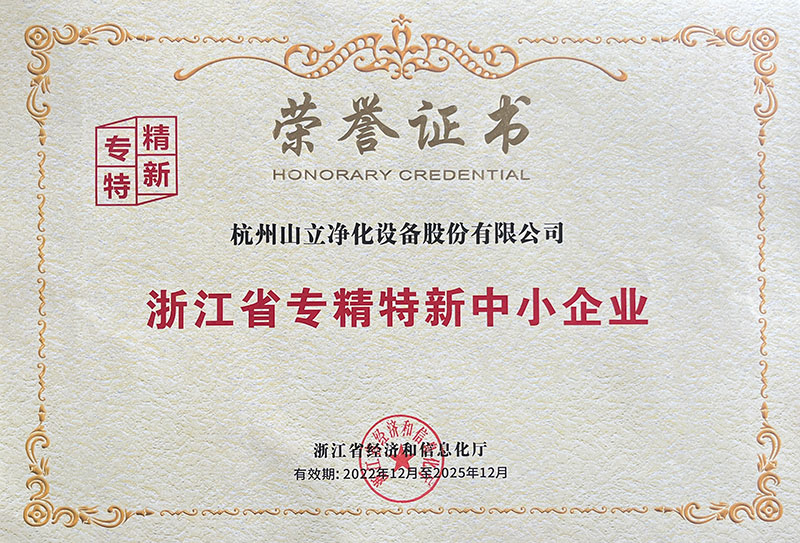 2023年,杭州山立被浙江省經(jīng)濟和信息化廳評定為浙江省“專精特新”中小企業(yè)。此次被認定為浙江省“專精特新”中小企業(yè),該稱號是對杭州山立凈化技術(shù)創(chuàng)新、產(chǎn)品服務(wù)、經(jīng)營發(fā)展及綜合實力等方面的認可和肯定。