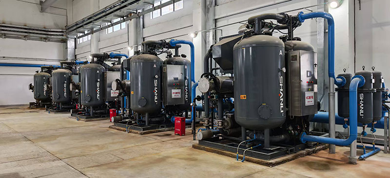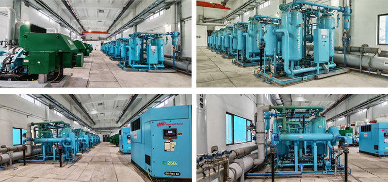 本工程兩臺(tái)機(jī)組的二級(jí)氣力輸灰系統(tǒng)共配置5臺(tái)微油螺桿式空氣壓縮機(jī)。與之配套的是我司5套鼓風(fēng)熱再生吸附式干燥機(jī),協(xié)同相關(guān)過(guò)濾器,構(gòu)建起完整高效的氣源處理體系。